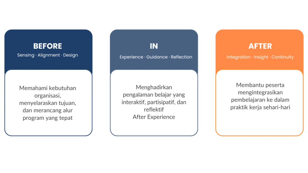 Pendekatan kami tidak hanya berfokus pada solusi jangka pendek, tetapi juga memastikan setiap program selaras dengan arah bisnis dan dinamika organisasi.