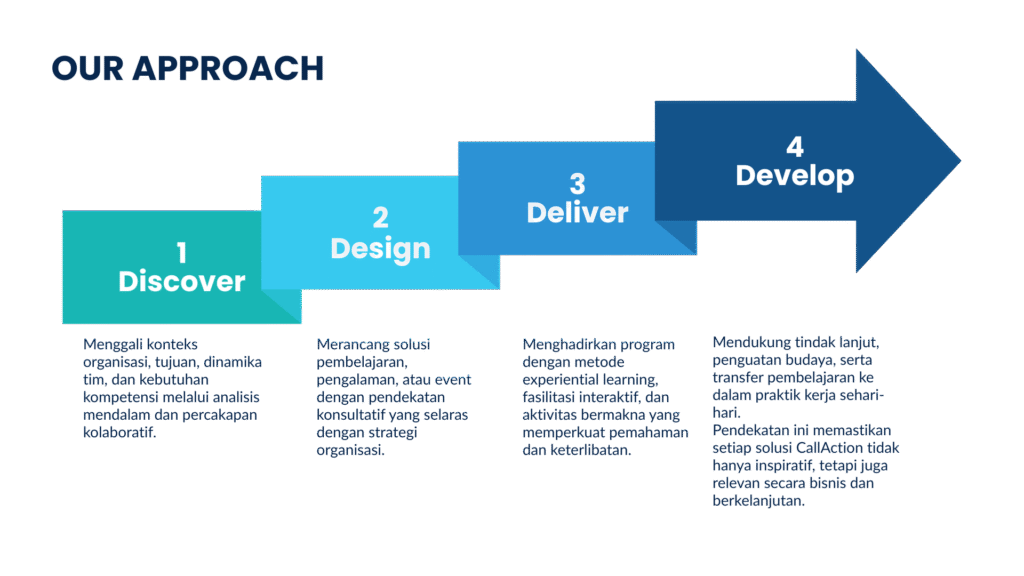 Melalui pendekatan experiential dan mindful, CallAction membantu membangun proses belajar, kolaborasi, dan pertumbuhan yang relevan dan bermakna bagi individu, tim, dan komunitas belajar.