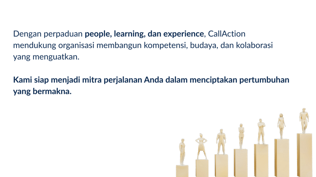 CallAction berkomitmen menghadirkan solusi pengembangan manusia yang: Strategic — selaras dengan tujuan organisasi Experiential — dirasakan, dipahami, dan diterapkan Human-Centered — menghargai setiap individu Collaborative — dibangun bersama mitra dan klien Sustainable — menciptakan pertumbuhan jangka panjang